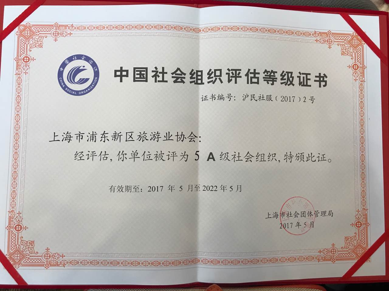 近日,上海市浦东新区旅游业协会荣获“中国社会组织评估等级”5A级社团组织,上海市社会团体管理局颁发了证书和铜牌。