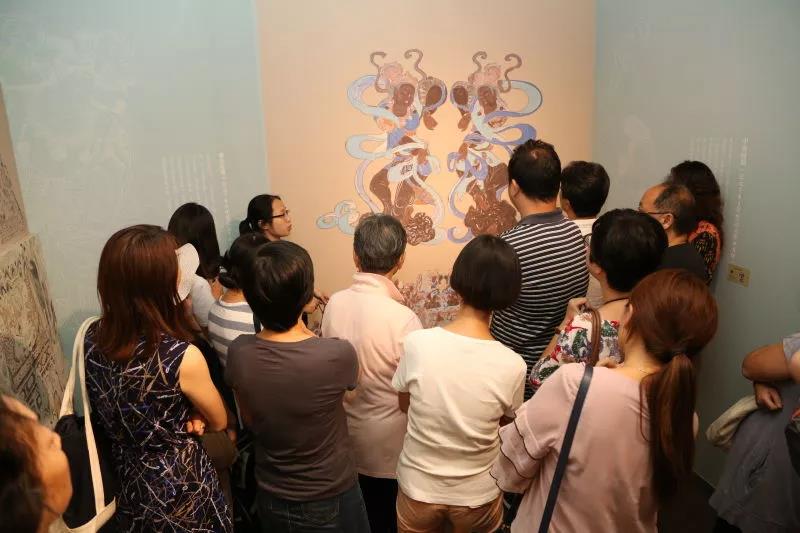 讲座后学员们参观了艺术馆正在展出的“敦煌乐舞壁画”展,这个展出半月吸引二万多观众的展览就非同凡响,绘画VS音乐+壁画VS科技=多元化跨界呈现,CG特效+虚拟洞窟=敦煌展新模式,新媒体打造全息舞台,多感官体验动态乐舞,学员们似乎身临其境入洞而栖,伎乐回响、舞动敦煌,展览让古老壁画上的人物动了起来,学员在志愿者生动而有情感的讲解下,对敦煌乐舞壁画在新媒体下的展现惊叹不己,对敦煌文化的辉煌激动万分。此次讲座与参观的新课堂形式得到了广大学员们的欢迎和支持!