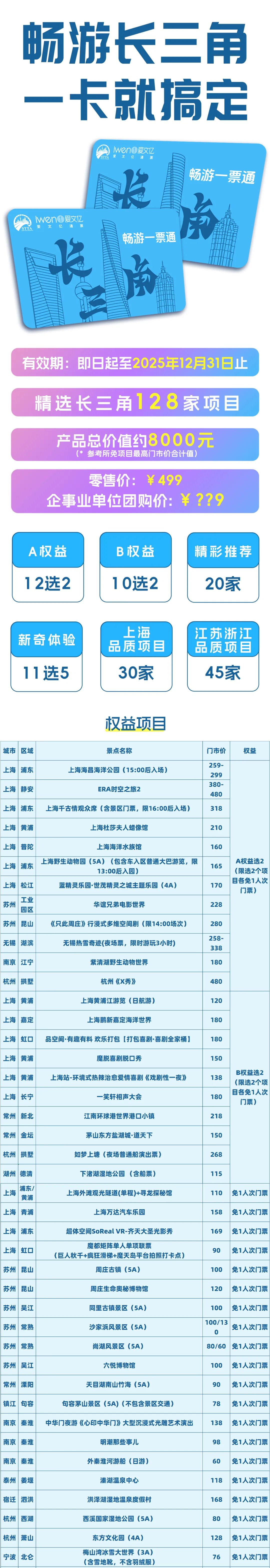 《2025畅游长三角一票通》精选长三角128家景点, A权益12任选2项,B权益10任选2项,外加100家景点各免一次,更新率达58%,包括#上海千古情、#上海海昌海洋公园、#杜莎夫人蜡像馆、#华谊兄弟电影世界,无锡热雪奇迹、上海野生动物园、杭州《X秀》等总价值超8000元!市场价499元,#企业福利价仅需299元! 使用日期即日起-2025年12月31日。