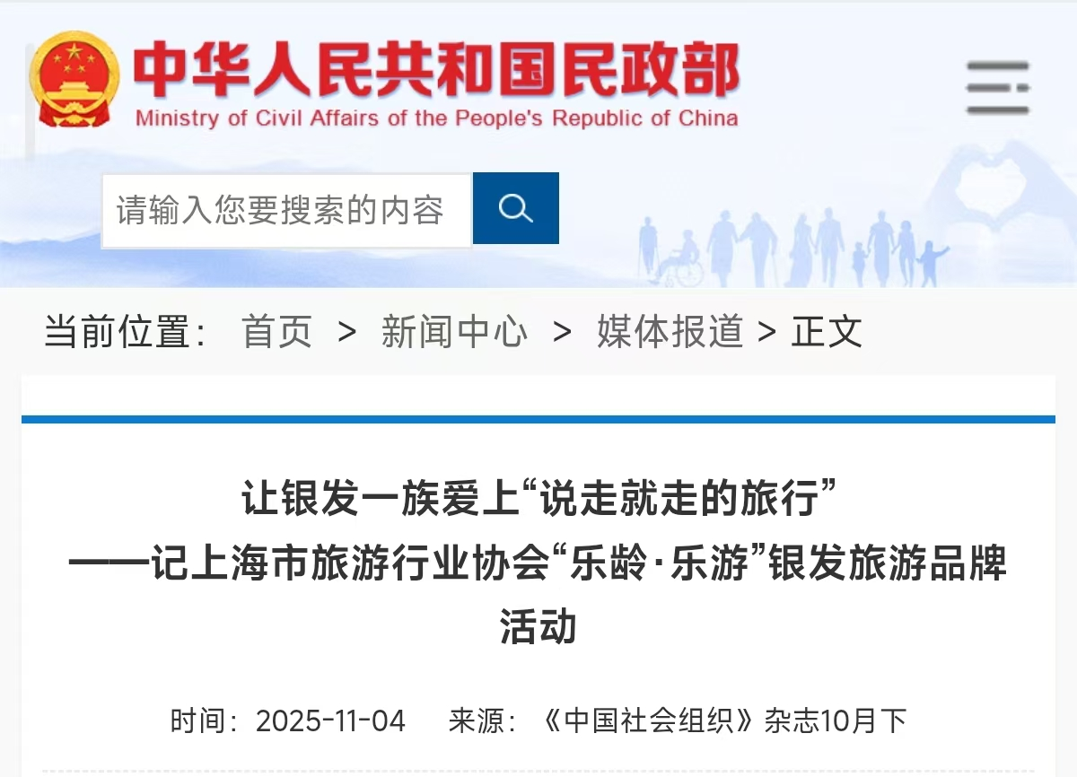 当前,该项“乐龄·乐游”银发旅游品牌活动凭借创新的服务模式与显著的实践成效,不仅获得国家民政部官网专题转发,还被民政部社会组织官方杂志首页刊登,成为全国社会组织领域银发旅游服务兼具示范性与引领性的标杆案例。